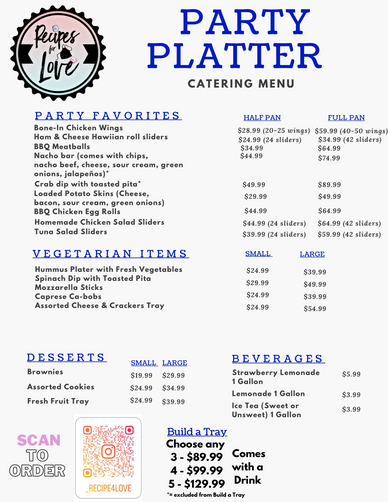 Hosting game night or a special event is no problem with Recipes for Love. Our Party Food menu is created to give flavorful small bite options that everyone will enjoy!