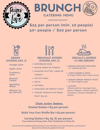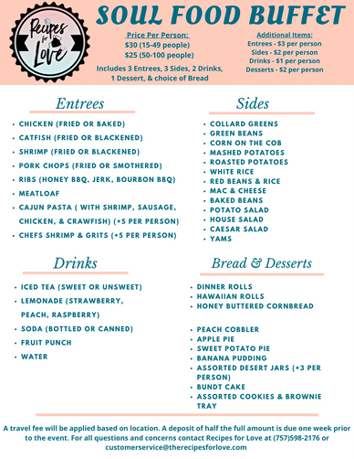 Wan to provide a delicious meal with your event? Look no further than Recipes for Love! Our Soul Food menu is sure to satisfy your hunger and your heart.